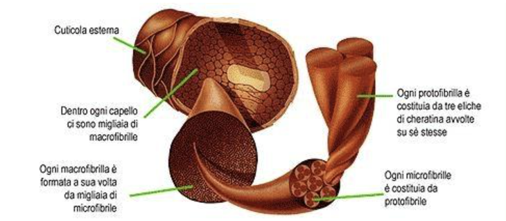 80% of the weight of hair is due to the presence of protein (amino acid polymers), among which the main one is keratin, composed of 18 amino acids.