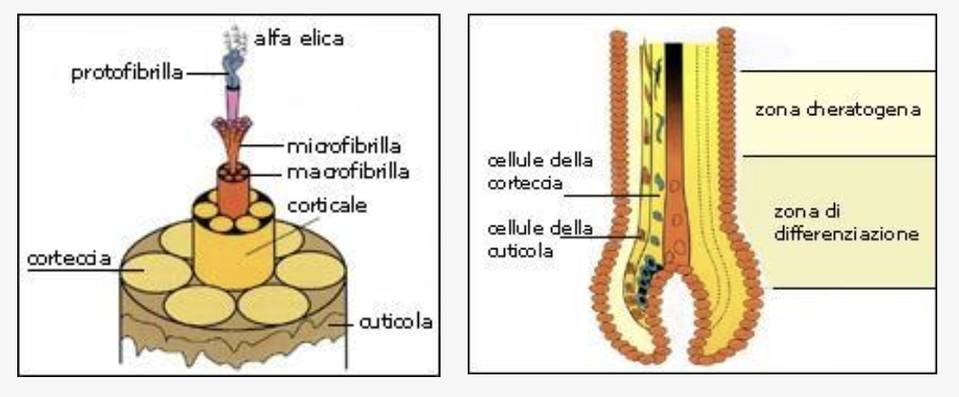 En plus de l’eau, les substances chimiques qui constituent les cheveux sont : la kératine, les lipides, les sels minéraux et les pigments. La kératine est une protéine que l’on trouve dans le cortex. La kératine est composée de 18 acides aminés dont les principaux sont la cystéine, la cystine, la sérine, l’acide glutamique, la glycine, la thréonine, l’arginine, la valine, la leucine et l’isoleucine. La kératine alpha, fibreuse et à faible teneur en soufre, est la protéine que l’on trouve en plus grande quantité dans les cheveux. Elle a une masse moléculaire d’environ 45000 et elle est insoluble dans l’eau. La kératine peut être déformée par la vapeur d’eau (mise en plis).