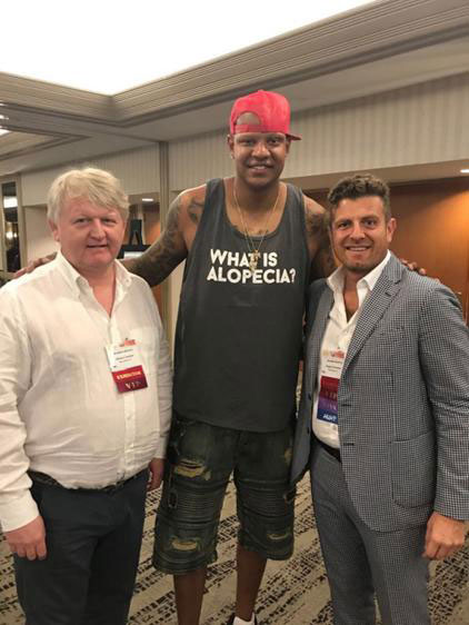 Stefano Ospitali CEO e Angelo D’Andrea Direttore Operativo CRLabs con Charlie Villanueva campione di basket NBA che soffre di alopecia universale con la maglietta della sua fondazione chiamata “What is alopecia?” nata per informare e far conoscere questa malattia che colpisce il 2% della popolazione.