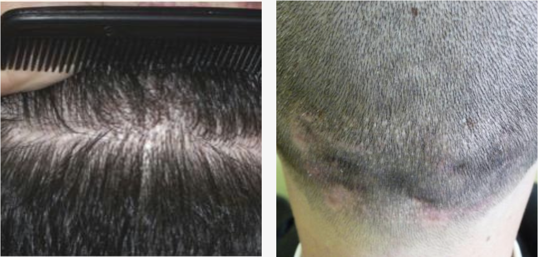 Questa tecnica inoltre, più lenta della precedente, ha lo svantaggio di non permettere un grosso numero di innesti nell’unità di tempo. La tecnica F.U.E. lascia delle cicatrici puntiformi che possono essere notate unicamente ad una attenta osservazione. Dall’ area donatrice (occipitale e parietale) si estraggono, con uno speciale strumento di 0,8/0,9/1,0 mm le unità follicolari con tecnica poco traumatica. I forellini generati dal microbisturi per l’estrazione dei follicoli si richiudono da soli senza bisogno di punti in pochi giorni determinando migliaia di micro-cicatrici biancastre di un millimetro nella zona donatrice.